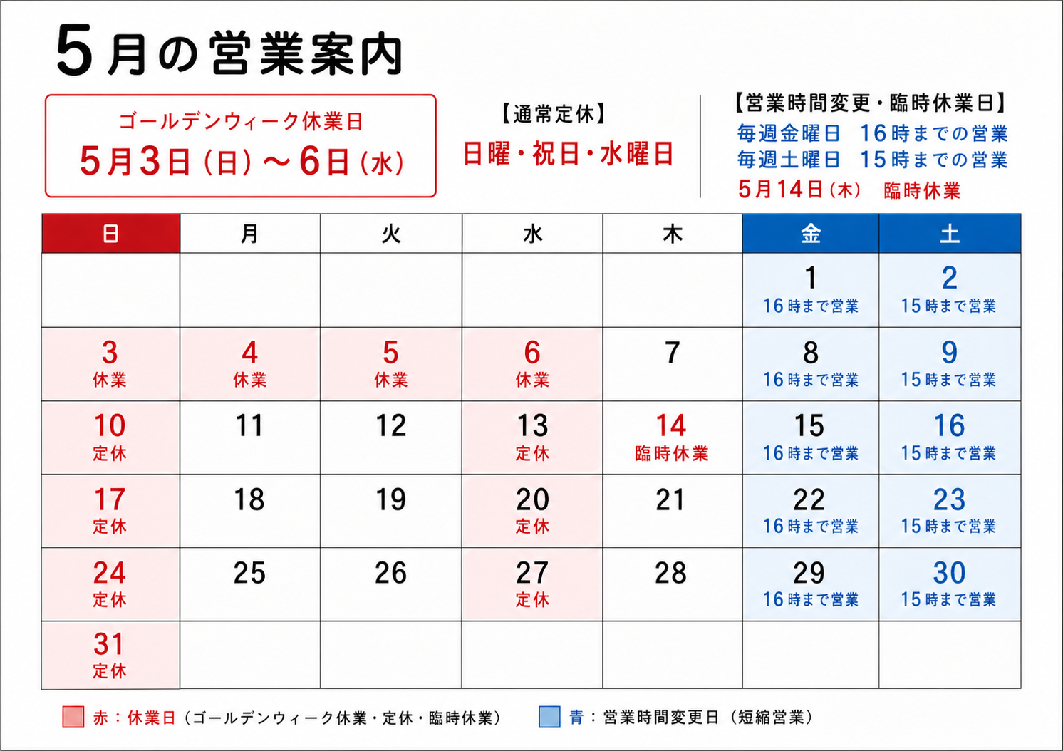 2026年5月の営業予定